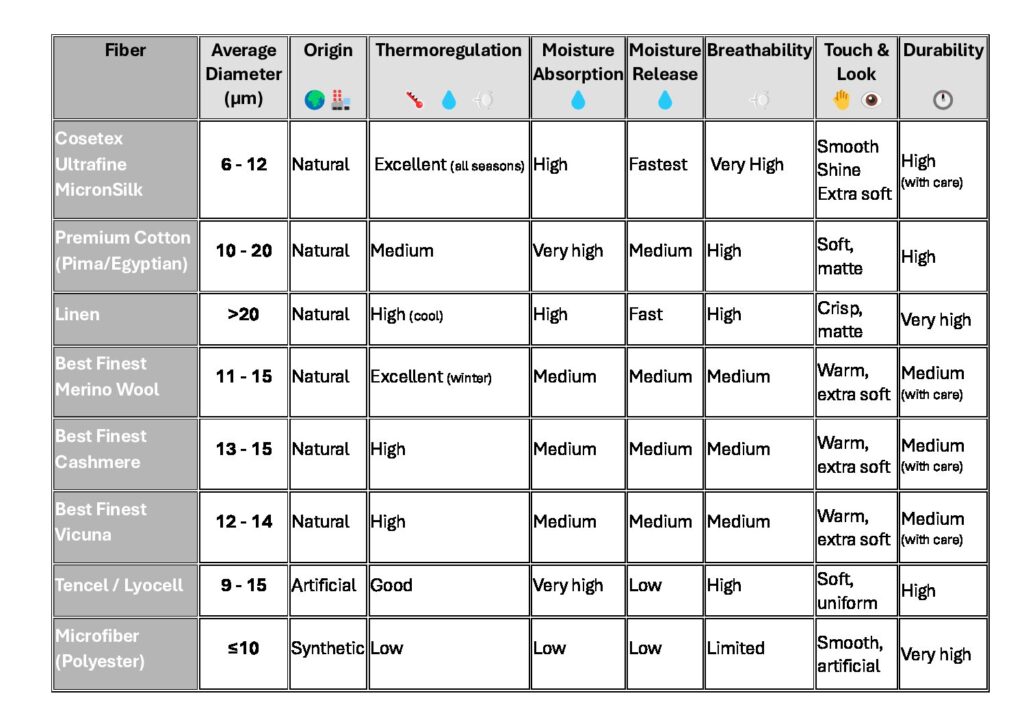 Clicca sull’immagine per aprire la tabella di comparazione seta ultrafine altre fibre